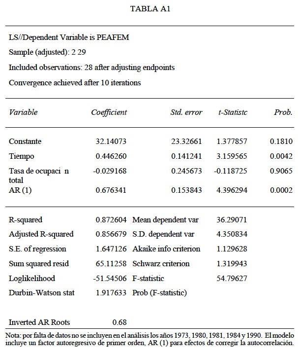 El coeficiente β1 representa la contribución de la componente tendencial, o variación media anual de la tasa de actividad femenina, mientras que β2 expresa la componente cíclica o variación de la tasa cuando la ocupación varía en una unidad. Los resultados de la prueba (tabla A1) para el total agregado de la PEA femenina en el periodo analizado, ajustados con la inclusión de un factor autoregresivo de primer orden (AR), muestran que sólo el coeficiente tendencial es significativo con p < 0.01 y no así el referido a las variaciones en la ocupación total a lo largo del periodo. Significa que, en gran medida, la evolución de la actividad económica de la mujer responde a una tendencia estructural de largo plazo, sobre la que confluyen diversos factores, y tienen un menor peso relativo los componentes cíclicos asociados con la dinámica general de las ocupaciones.