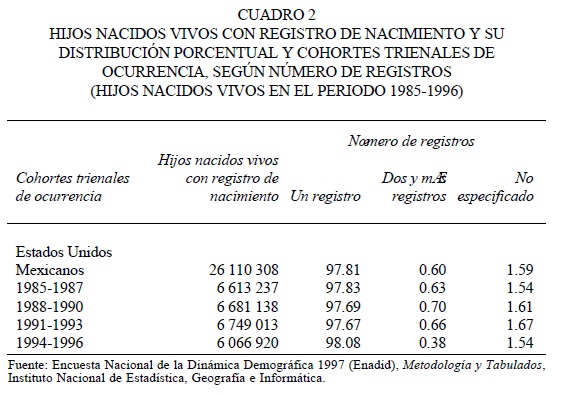 En el cuadro 2 se presentan los hijos nacidos vivos con registro de nacimiento y cohortes trienales de ocurrencia. Como puede verse en este cuadro, a partir de la Encuesta Nacional de la Dinámica Demográfica de 1997 (Enadid-97), el caso de dos y más registros de hijos nacidos vivos no llega siquiera a 1 por ciento, por lo que parecería que esta problemática no es significativa. Los registros múltiples no explicarían la diferencia entre los nacimientos registrados y los nacimientos estimados por Conapo.