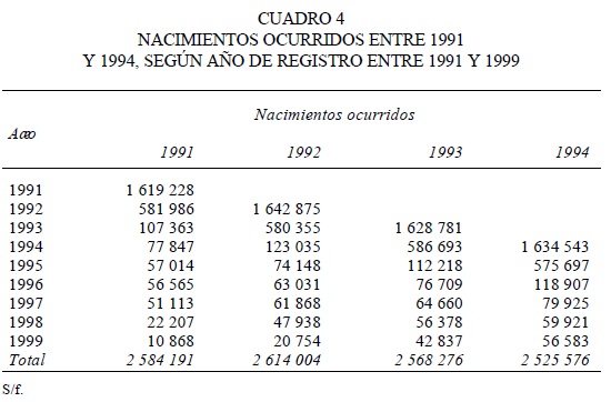 En el cuadro 4 se presentan los nacimientos ocurridos en el periodo de 1991 a 1994. Estos números también representan cotas mínimas del número de nacimientos; sin embargo, dan una idea del orden de magnitud del número de nacimientos. Hay que reconocer que faltan los registros posteriores al año 2000.