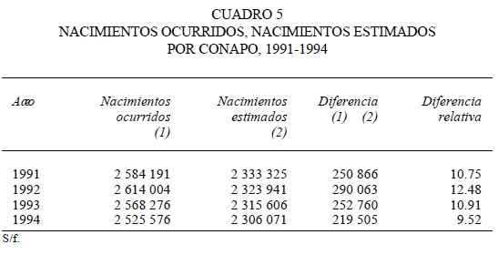 En el cuadro 5 se comparan los nacimientos ocurridos (que representan cotas mínimas de los nacimientos reales) entre 1991 y 1994 con las estimaciones de los nacimientos calculados por Conapo para el mismo periodo.