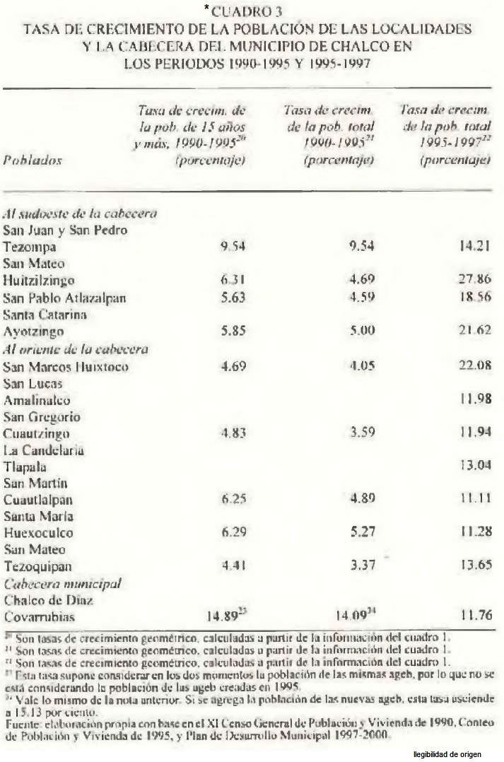 7 Esta es la tasa de crecimiento de la población mayor de 14 años de la ageb número 113-1 entre 1990 y 1995. En la colonia Jardines de Chalco, al sur de la anterior, encontramos la ageb 108-0 que en el mismo quinquenio presenta una tasa de crecimiento de 31.02 por ciento para la misma población. En casi todas las ageb's de la cabecera, la población creció entre 1990 y 1995 a tasas semejantes, incluso en el casco de San Juan fue de 12.37 por ciento, a excepción de la zona oriental de la cabecera, en donde el crecimiento ha sido mucho menor, con tasas aproximadas de 4 a 5 por ciento para el mismo quinquenio.