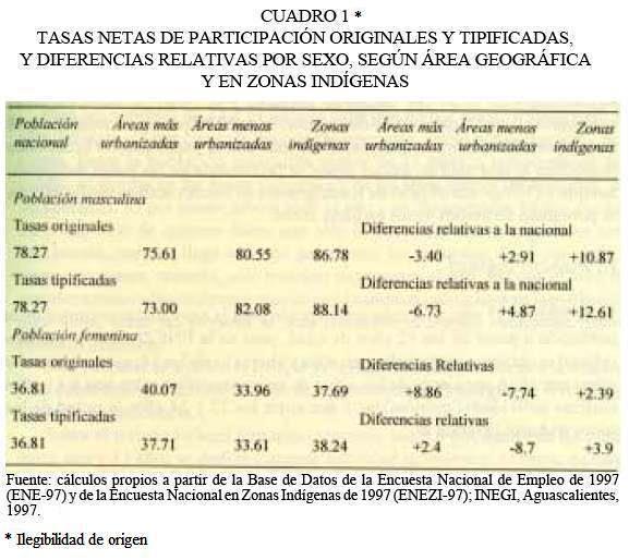 Al observar en el cuadro 1 las tasas de participación originales de la población masculina, vemos que en las en áreas más urbanizadas las tasas son más bajas que el promedio nacional en 3.4 por ciento. Por el contrario, en las menos urbanizadas supera al nacional en 2.9 por ciento, y en las zonas indígenas la diferencia es aún mayor, superándola en 10.9 por ciento. Al tipificar se observa que las diferencias se agudizan: en las áreas más urbanizadas la estructura por edad favorece a una tasa mayor porque recibe inmigrantes en edad de trabajar procedentes de las zonas rurales, por ello la diferencia negativa respecto a la nacional casi se duplica, llegando a 6.7; el impacto de la emigración en las otras áreas es desfavorable, y es aún mayor el perjuicio de la salida de trabajadores en las zonas indígenas, donde la tasa sin la emigración sería un 12.6 por ciento superior.
