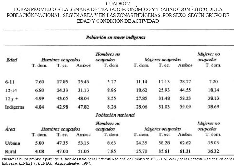 En el cuadro 2 se presentan las horas promedio que en la semana de referencia le dedicaron a las distintas actividades. En igualdad de circunstancias el tiempo que las mujeres le dedican al trabajo doméstico siempre es superior respecto al de los hombres; o sea, si se comparan mujeres con hombres ocupados o mujeres con hombres no ocupados. Esto sucede en zonas urbanas y rurales, así como en zonas indígenas y dentro de ellas en la población definida como indígena. Lo contrario sucede con el trabajo económico, donde los hombres superan a las mujeres, con excepción del trabajo infantil, que en zonas indígenas el femenino llega a superar al masculino.