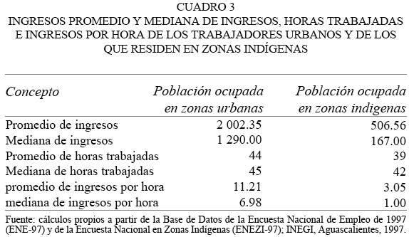 Para profundizar en el estudio de los ingresos obtenidos, otra forma de abordar el tema es a través de índices más sintéticos como es el pago por hora trabajada, que permite verificar o rechazar la hipótesis de que los bajos ingresos se deben a pocas horas de trabajo involucrado. Para simplificar la exposición, pero señalando los contrastes, sólo se comparan las zonas indígenas con las zonas urbanas (cuadro 3); en otros indicadores ya hemos visto que el conjunto nacional siempre está por abajo del urbano y por encima de las zonas menos urbanizadas.