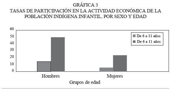 En las zonas indígenas, la participación de la población masculina es superior a la registrada en el conjunto nacional; en edades extremas también es superior en las zonas indígenas, trabajan desde niños hasta el fin de sus días. La emigración de personas de zonas indígenas en edades adultas afecta negativamente las tasas de participación en su lugar de origen, lo cual es compensado con trabajo infantil.