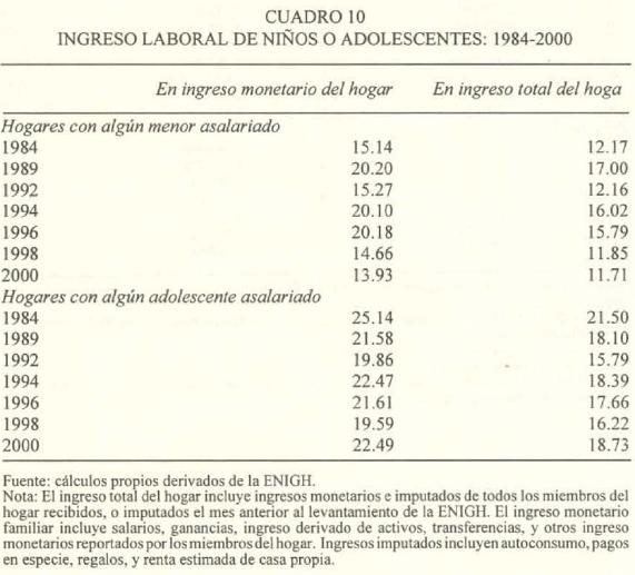 Los ingresos de los niños y adolescentes asalariados representan una parte importante del ingreso familiar total. Como se muestra en el cuadro 10, de 1989 a 1996 el ingreso de los niños representó alrededor de 20 por ciento del ingreso monetario del hogar o 16 por ciento del ingreso total del hogar. Esta cifra decreció en los años siguientes, ubicándose en 14 por ciento en 2000. La proporción del ingreso de los adolescentes en los ingresos del hogar no se modificó en el periodo de estudio, representando alrededor de 20 por ciento del ingreso monetario total familiar. Debido a que las horas trabajadas no se redujeron de manera importante en 2000, es probable que la importante reducción en la proporción de los ingresos de los niños asalariados en el ingreso del hogar, de 1996 a 2000, se deba al crecimiento del ingreso total del hogar, que aumentó 41 por ciento en términos reales entre estos años.