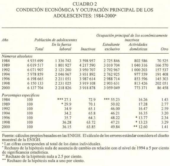 En cuanto a la estructura de las actividades de los adolescentes, de 1984 a 1994, la proporción de trabajadores aumentó y la de estudiantes disminuyó. De 1994 a 2000, la participación laboral se mantuvo constante, a un nivel de 34 por ciento; la proporción de los dedicados a los quehaceres del hogar disminuyó; la de estudiantes exclusivos no se modificó (cuadro 2). De manera tentativa, estos resultados indican que los probables efectos positivos del Progresa en los adolescentes rurales no han sido tan grandes como entre los niños para que modifiquen los indicadores a nivel nacional. Más adelante, al desagregar la condición económica según la asistencia escolar, veremos que la proporción de estudiantes rurales aumentó.