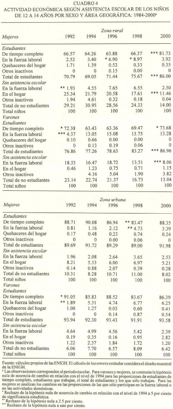 El cuadro 4 muestra la composición de la actividad económica según la condición de asistencia escolar de los niños por sexo y zona de residencia de 1992 al año 2000; las observaciones corresponden al periodo escolar. Nótese que la proporción de estudiantes entre mujeres y varones urbanos, alrededor de 90 por ciento, prácticamente no se alteró en relación con 1994, Para los niños urbanos, la composición de sus actividades económicas y su asistencia a la escuela no cambió de 1994 a 2000. En contraste con el caso urbano, en 2000, la proporción de estudiantes rurales aumentó: entre las mujeres 17 puntos porcentuales, y entre los varones, 10. Esos incrementos fueron acompañados de reducciones de las mujeres dedicadas a las labores domésticas, que disminuyeron su importancia 10 puntos porcentuales; entre los varones, la proporción de los que sólo trabajan se redujo ocho puntos porcentuales. Es importante notar que las proporciones de estudiantes exclusivos para hombres y mujeres aumentaron en las mismas cantidades que lo hizo la proporción de estudiantes.