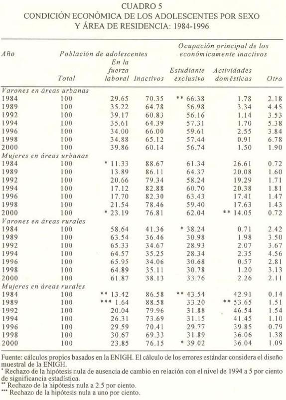 Discutamos ahora los cambios en las actividades económicas de los adolescentes. De 1992 a 2000, la estructura correspondiente a los varones se mantuvo inalterada mientras que hubo algunos cambios en la estructura de las mujeres en 2000. Entre las mujeres urbanas, de 1994 al 2000, su proporción en la fuerza laboral aumentó seis puntos porcentuales; paralelamente disminuyó cinco puntos porcentuales la proporción de mujeres dedicadas a las labores domésticas. Entre las mujeres rurales, sólo en 2000, la proporción de mujeres estudiantes de tiempo completo aumentó ocho puntos porcentuales respecto al nivel de 1994. La proporción de mujeres dedicadas al hogar, 36 por ciento en 1998 y 2000, no mostró ninguna reducción estadísticamente significativa en la década de 1990,