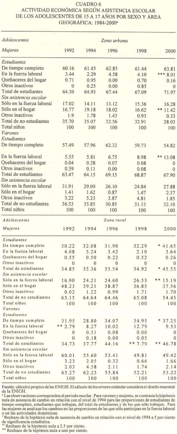 El cuadro 6 muestra la ocupación principal según condición de asistencia a la escuela entre los adolescentes por sexo y área geográfica; se utilizaron las observaciones correspondientes al periodo escolar. Sin distingo de sexo, la proporción de estudiantes urbanos no se modificó pero sí la de los rurales. Entre las mujeres urbanas la proporción de aquellas que estudian y trabajan se incrementó de 2.3, en 1994, a ocho por ciento, en 2000, mientras que el porcentaje de las dedicadas a las labores domésticas decreció de 19 a 11 por ciento. Entre los varones urbanos aumentó la proporción de los estudiantes que trabajan, de seis a 13 por ciento.