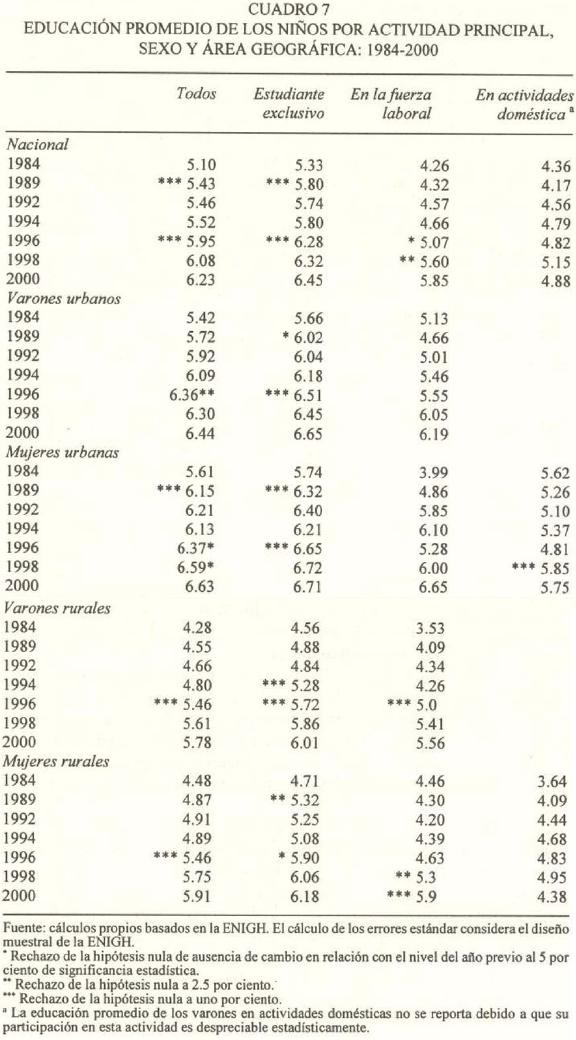 Sólo entre los niños económicamente activos el atraso escolar promedio, respecto al grupo de estudiantes de tiempo completo, se redujo a fines de la década de 1990. En 2000, su atraso fue de 0.6 (=6.45-5.85) años de educación mientras en 1984 equivalió a un año. El atraso escolar relativo de los niños dedicados a actividades domésticas excede un año de estudios. El incremento educativo en las áreas rurales ha tenido como consecuencia que las diferencias en los años completos de educación de hombres y mujeres rurales, respecto a sus pares urbanos, disminuya a menos de un año a fines de la década de 1990 (cuadro 7).