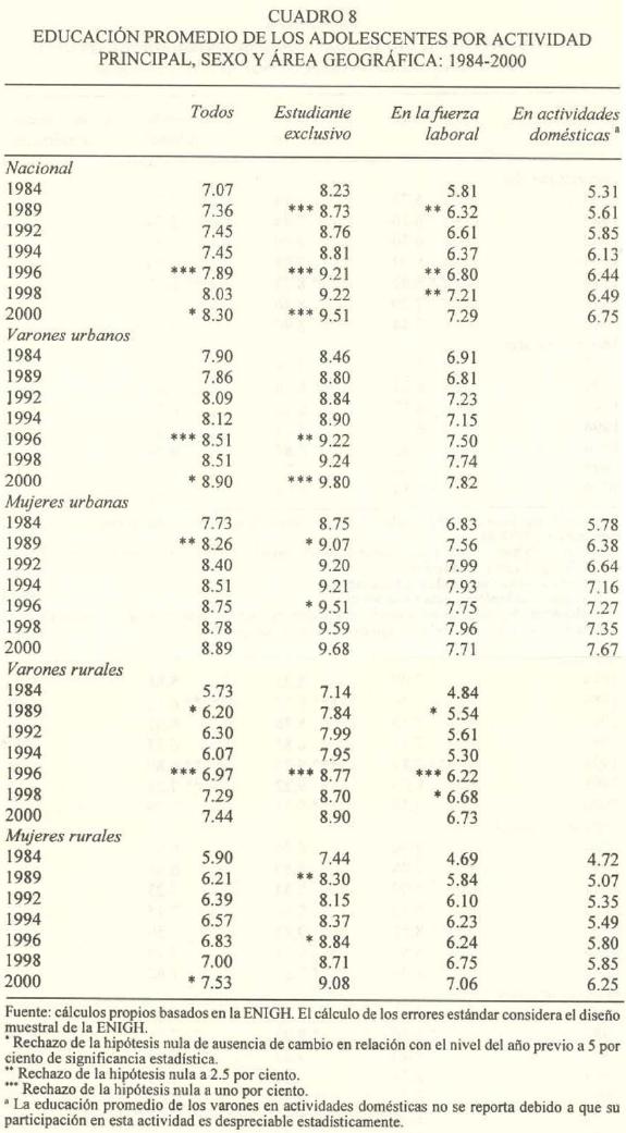 El cuadro 8 presenta los años de educación promedio de los adolescentes. En el ámbito nacional se observa una mejoría global de su promedio educativo de siete años de educación, en 1984, a ocho, en 2000. El promedio educativo de los adolescentes que sólo estudian excedió el promedio del resto de los grupos. Es notorio que a pesar del incremento en la educación de todos los grupos de adolescentes, el atraso escolar de este grupo en la fuerza laboral o en las actividades domésticas, comparado con la educación de los estudiantes exclusivos, no disminuyó de 19S4 a 2000. En 2000, ese rezago fue de 2.2 años para aquellos que estaban en la población económicamente activa y de 2.8 para los que trabajaron en labores domésticas.