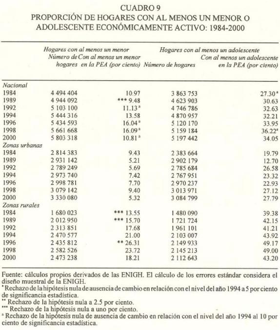 La participación laboral de niños y adolescentes es importante entre las familias. El cuadro 9 muestra las cifras absolutas y relativas de hogares con al menos un menor o adolescente en la fuerza laboral de 1984 a 2000. A nivel nacional, la proporción de hogares con un menor en la población económicamente activa aumentó de 1994a 1996 y 1998, pero disminuyó en 2000 a los niveles del año de referencia; la proporción de hogares con adolescentes trabajando no se redujo de 1994 a 2000.