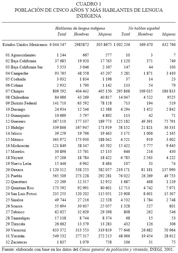 Como se puede apreciar en el cuadro 1, todas las entidades federativas cuentan con población indígena; Oaxaca es el estado que registra mayor cantidad de hablantes de lenguas indias, mientras que los estados de Aguascalientes y Zacatecas son los que tienen el número menor. También podemos observar un fenómeno relativamente nuevo, pero además creciente: el aumento y presencia de la población indígena en las grandes ciudades, y de manera particular en la ciudad de México, donde hay más de 140 000 hablantes pertenecientes a, por lo menos, 86 por ciento de las lenguas indígenas que se hablan en México; es decir, que en el Distrito Federal se encuentra el mosaico etnolingüístico del México moderno, denotando a la vez el cambio del indio rural por el citadino, que se ha incorporado a variadas actividades socioeconómicas distintas al campo, como consecuencia de un permanente proceso de migración interna.