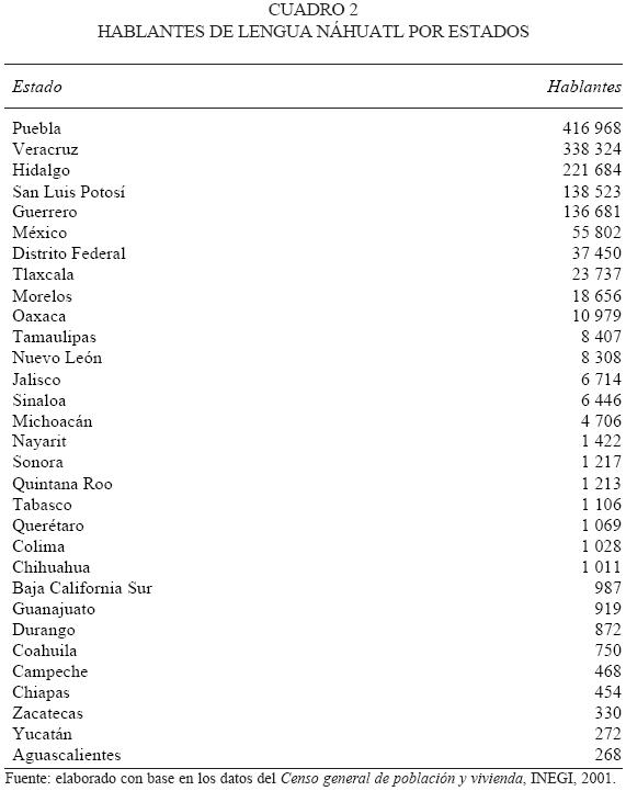 Como se puede apreciar en el cuadro 2, los hablantes de náhuatl se encuentran en todos los estado de la federación, excepto en Baja California. Las entidades de Puebla, Veracruz, Hidalgo, San Luis Potosí, Guerrero y México concentran un poco más de 90 por ciento de los hablantes indígenas de náhuatl. Aguascalientes, Zacatecas y Yucatán son las entidades que reportan el menor número de hablantes, y Baja California es el único estado que no tiene hablantes de náhuatl.