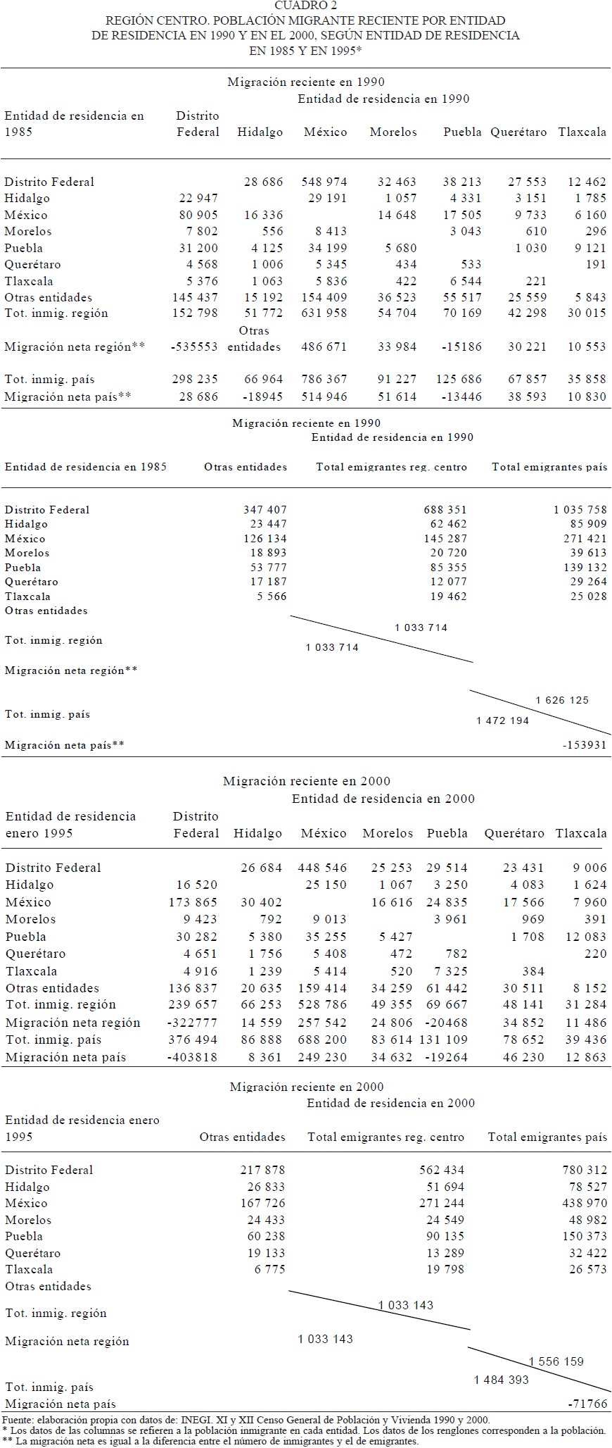 Producto de las variaciones en las entradas y salidas ocurridos en 1990 y en 2000, el Distrito Federal reduce su saldo neto migratorio negativo de 535 553 personas a 322 777; el estado de México disminuye el saldo migratorio positivo de 486 671 personas a 257 542; Puebla incrementa su saldo migratorio negativo; Morelos y Querétaro mantienen su dinámica y continúan ganando población, en especial Querétaro, y como cambio notable a resaltar entre las entidades de esta región, se tiene la modificación del carácter migratorio en el estado de Hidalgo, pues de ser negativo en 1990 pasa, por primera vez, a positivo en el año 2000 (cuadro 2).