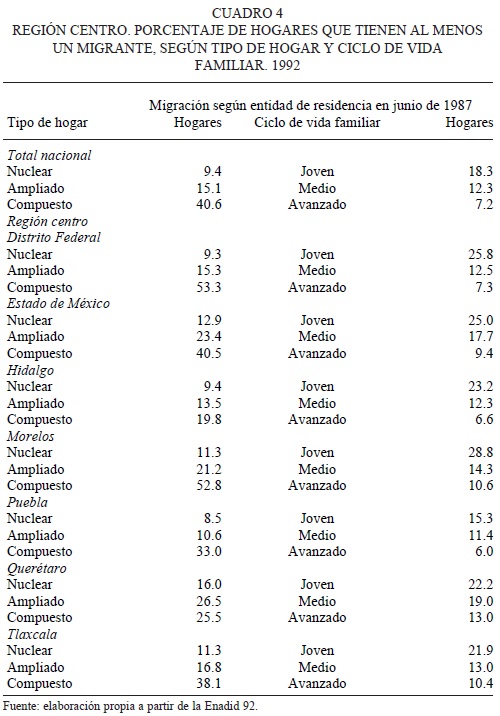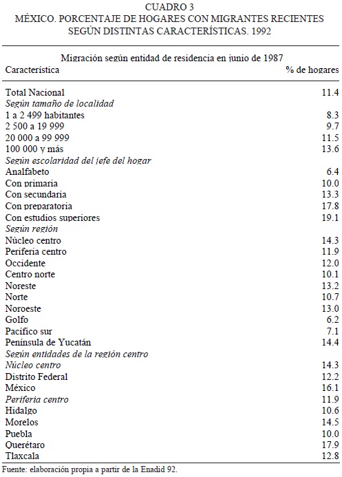 En un primer acercamiento a esta perspectiva, se trabajará, con la información de la Encuesta Nacional de la Dinámica Demográfica (ENADID) de 1992,9 la vinculación entre algunas características de los hogares y la migración reciente.10 Dejamos para un trabajo posterior el análisis con la información del censo de 2000, que además nos permitirá la comparación de lo ocurrido en los últimos años en términos de la dinámica migratoria.