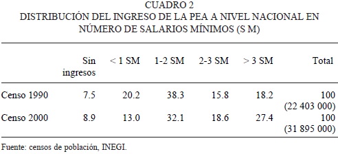 Por otra parte, bajo la presión de una inflación descontrolada y de pactos sociales generalmente desfavorables para los asalariados, el poder de compra de los salarios decrece de manera casi continua desde el inicio de la década de 1980, empobreciendo la mayor parte de la población. El salario mínimo perdió 78 por ciento de su poder de compra en un cuarto de siglo (1976-1999). A pesar de una reestructuración progresiva de la distribución de los ingresos orientada al alza, éstos siguen concentrados en torno a dos sueldos mínimos (cuadro 2).