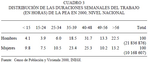 Estos niveles de ingresos están asociados a un subempleo importante, que se puede observar a partir de la distribución de las duraciones semanales de trabajo (cuadro 3). En el grupo central, cuyo tiempo de trabajo está entre 40 y 48 horas, cerca de 60 por ciento de los trabajadores percibe remuneraciones inferiores a dos salarios mínimos. Gran parte de los individuos que laboran más que la duración legal del trabajo (48 horas, pero 40 horas en las grandes empresas) son trabajadores por cuenta propia, concentrados en el comercio, los servicios y la agricultura.