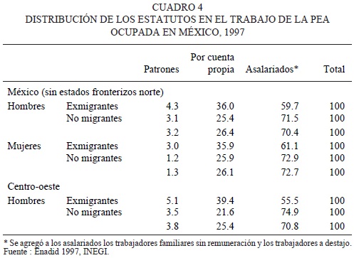 Las distribuciones de la posición en el trabajo (o condición laboral) de la población ocupada en 1997 son muy parecidas entre el grupo de estados del centro-oeste y el conjunto del país, y se notará que los exmigrantes internacionales pertenecen mucho más al conjunto de los no asalariados (patrones y trabajadores por cuenta propia) que los individuos que nunca trabajaron en los Estados Unidos (cuadro 4). Los exmigrantes están sobrerrepresentados en la rama agrícola (42.6 por ciento de los exmigrantes masculinos trabajan en esta rama, respecto a 32.1 por ciento de los no-migrantes), efecto de décadas de emigración internacional predominantemente rural del programa bracero.