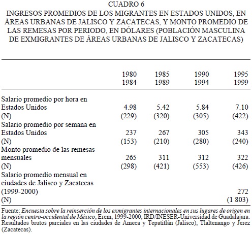 El salario promedio percibido en Estados Unidos por los exmigrantes masculinos de las áreas urbanas de Jalisco y Zacatecas se ubicó aproximadamente en 1 400 dólares a finales de la década de 1990, según la encuesta Erem, o sea, entre cuatro y cinco veces el salario promedio nacional en el sector "moderno" (afiliados al Instituto Mexicano del Seguro Social) en México para esta época, o cinco veces en el caso de los asalariados de las ciudades del centro-oeste (cuadro 6). Sin embargo, se puede pensar legítimamente que el multiplicador de salarios se ubica entre la relación de los salarios mínimos y la de los salarios promedios, tratándose de una población migrante originaria generalmente del sector informal, levemente menos educada y más joven que la población de no migrantes.