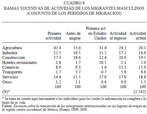 Para gran parte de los migrantes, el ciclo migratorio se traduce en reconversiones tanto de rama de actividad como de posición en el trabajo (condición laboral) entre la situación premigratoria y la reinstalación en sus lugares de origen a su regreso a México. En términos de ramas de actividad, el cuadro 8 nos permite visualizar el deslizamiento de los empleos ocupados por los migrantes masculinos del sector primario (esencialmente la agricultura) hacia el sector terciario (comercio, servicios, transportes y telecomunicaciones) al terminar el ciclo migratorio. Estas transformaciones empiezan antes de la emigración a Estados Unidos (a veces asociadas a migraciones internas previas de áreas rurales de los municipios hacia las cabeceras municipales de las ciudades medias encuestadas), pero se intensifican en la migración internacional. Este tipo de movilidad profesional es relativamente fuerte si se considera que 42 por ciento de los migrantes cambiaron de rama de actividad entre el momento de desplazarse a Estados Unidos y su reinserción laboral en México (las tasas de retención de los activos varían de 30 por ciento en los restaurantes-hoteles hasta 73 por ciento en los transportes, rama que conserva más su mano de obra durante todo el ciclo). En Estados Unidos, como se mencionó, la inserción laboral de los trabajadores masculinos, que hasta la década de 1960 se hacía en su mayor parte en la agricultura, se trasladó poco a poco hacia actividades de áreas urbanas, como la industria y la construcción a partir de 1980, donde los sueldos son generalmente más altos, y los restaurantes-hoteles, así como los servicios a partir de finales de la década de 1980. Los flujos femeninos que empiezan a desarrollarse en la década de 1970 se concentran tradicionalmente en la industria, los restaurantes-hoteles y los servicios.
