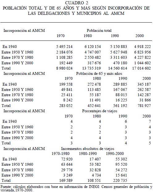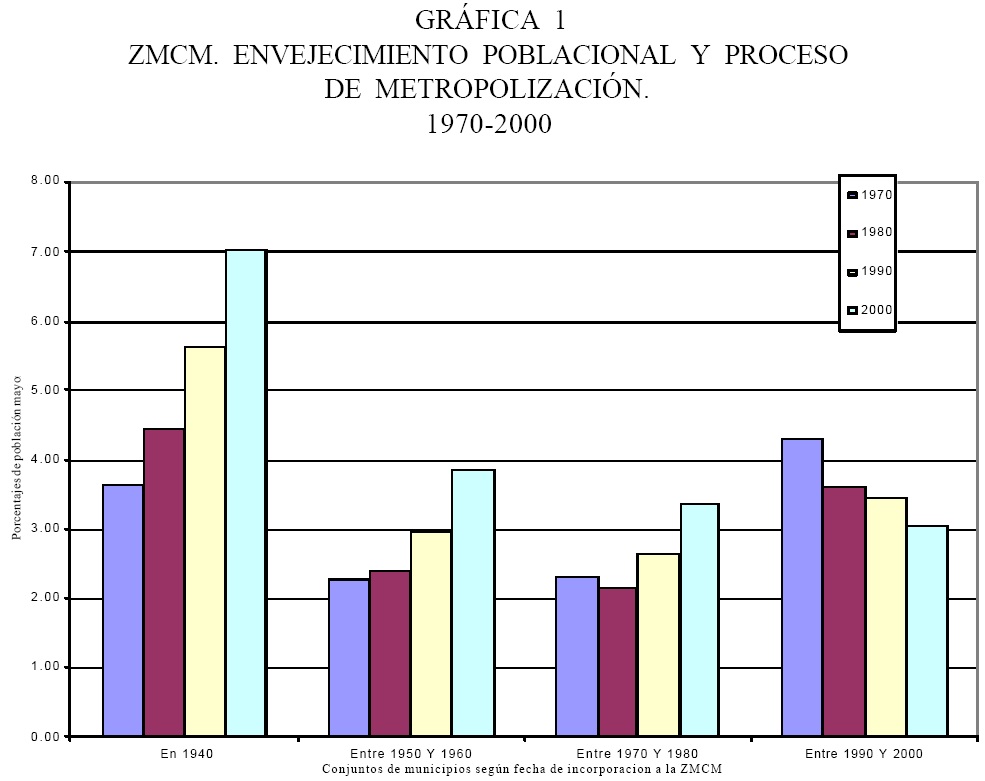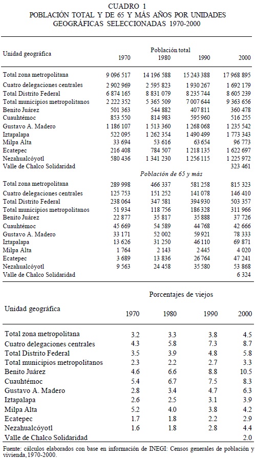Con el fin de derivar algunas conclusiones en cuanto a la vinculación entre esos procesos, se llevó a cabo un análisis utilizando información de los censos de población de 1970 a 2000 y se interpretaron los resultados con base en hallazgos de otros estudios referidos al comportamiento de la población mayor y al proceso de metropolización de la Ciudad de México.