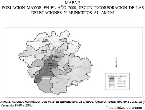 Como resultado del mismo proceso de incorporación al área funcional de esta gran metrópoli, encontramos el mayor número y los porcentajes más altos de personas de la tercera edad en las delegaciones centrales del Distrito Federal y las que conformaban la ZMCM en 1940, a la vez que queda de manifiesto la disminución paulatina tanto del número absoluto como relativo de esta población en las zonas que se fueron incorporando en décadas subsecuentes (mapa 2).
