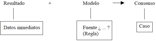 La regla no alude a leyes empíricas sino a hipótesis explicativas, hipótesis que se asumen como conjeturas verosímiles en función de elementos indiciales que, directa o indirectamente, refieren al fenómeno. El resultado se constituye de una serie de elementos que hacen referencia al caso. Dichos elementos configuran lo que podría denominarse "los sesgos del fenómeno", aquello que ha quedado como consecuencia o secuela del caso ya transcurrido, o como señales del caso que está ocurriendo. Dichas señales siempre son fragmentarias, debido a que el caso ya ha sucedido o esta sucediendo. El caso permanece oculto, como algo que debe ser develado. El caso (pasado o presente) se manifiesta a través de signos "observables": el resultado. La conclusión de la abducción es el caso, un caso que siendo singular, resume en sí las propiedades del universal; un caso que sin pretensión de mostrar variabilidad o frecuencias más probables, expresa configuraciones, vínculos entre variables y modos de funcionamiento.