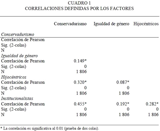 La matriz de correlaciones entre los factores construidos muestra que todas las correlaciones son significativas aunque no existe alta colinealidad entre las cuatro dimensiones. La correlación más alta es 0.455 y se da entre la dimensión institucionalista y el factor que denominamos conservadurismo. Todas las relaciones teóricas entre las variables se verifican en la matriz. En efecto, nosotros esperábamos que las personas que tenían un valor alto en la dimensión igualdad de género a su vez tuviesen relaciones negativas con los otros tres factores y eso se verifica en la matriz. A su vez, las personas que presentan un puntaje alto en la dimensión "hijocéntricos" también correlacionan alto en las dimensiones "institucionalista", y "conservadurismo" y tienen una relación débil y negativa con la dimensión "igualdad de género". Además de este análisis de correlación, se estudió la relación entre los factores ideológicos y cuatro variables independientes, para analizar la consistencia de los factores construidos con variables conocidas de estratificación social.
