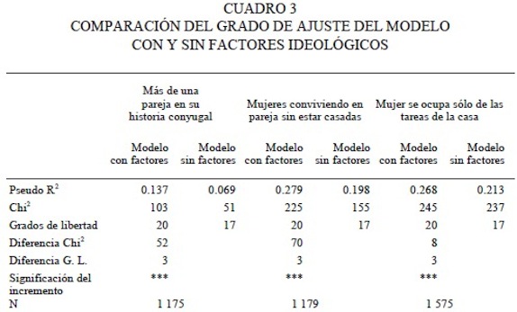 En este trabajo hemos mostrado que las variables ideológicas no pueden estar ausentes de la explicación del cambio familiar. En todos los casos, la inclusión de las dimensiones ideológicas aumenta significativamente la varianza explicada. Ésta pasa de 7 a 13 por ciento para el primer modelo (más de una pareja en la historia conyugal), y de alrededor de 20 a 27 por ciento en los otros dos (mujeres conviviendo sin casarse y el modelo que explica la división tradicional del trabajo doméstico).