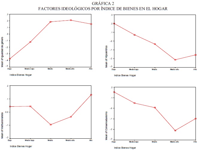 En las otras dos dimensiones ideológicas construidas, "hijocéntricos" y "conservadurismo", se verifica el mismo comportamiento descendente con respecto a la educación y el índice de bienes del hogar, siendo la relación con la educación la más importante como diferenciadora de grupos.