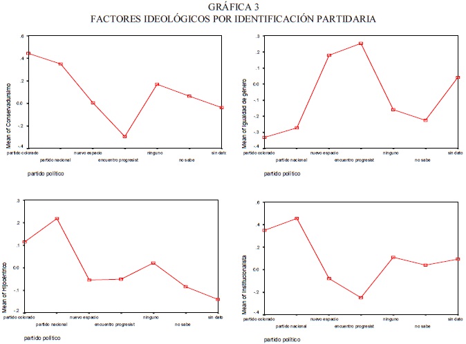Las relaciones entre los factores construidos y la identificación partidaria también muestran un alto grado de consistencia. Existe una clara asociación entre la simpatía hacia los partidos tradicionales y un alto grado de institucionalismo, hijocentrismo, conservadurismo y baja igualdad de género, mientras que lo opuesto ocurre entre los simpatizantes del Nuevo Espacio y el Frente Amplio-Encuentro Progresista. Ese alineamiento se mantiene en todas las dimensiones consideradas.