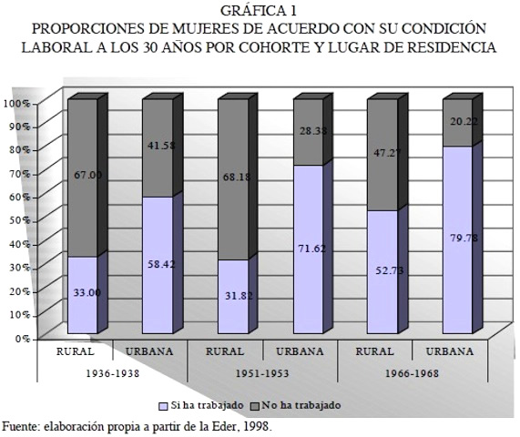 En cuanto a la residencia en zonas rurales se observa que la proporción de mujeres que hasta los 30 años no se ha incorporado al mercado laboral es mayor con respecto a las residentes urbanas; entre la cohorte madura y la intermedia la proporción muestra un ligero incremento, pasa de 67 a 68.2 por ciento, posteriormente, para la cohorte joven se disminuye hasta 47.3 por ciento. El hecho de que sólo una de cada dos mujeres residentes en localidades rurales haya trabajado al menos un año hasta los 30 años, podría ser evidencia de la "invisibilidad" que caracteriza la participación económica de las mujeres, ya que como diversas investigaciones lo señalan, las tareas extradomésticas que desempeñan las mujeres en diversos casos son percibidas por ellas mismas como parte de sus obligaciones domésticas, por ejemplo, diversas actividades de la producción agropecuaria se llevan a cabo dentro del ámbito doméstico.17