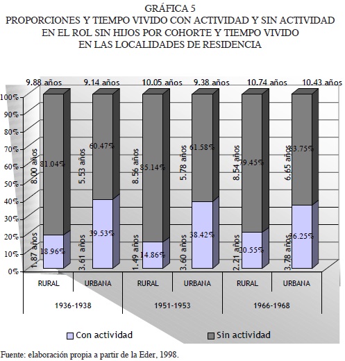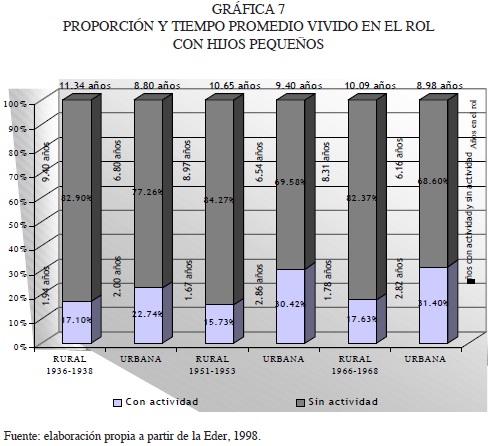 Las proporciones y el tiempo vivido en la actividad en el rol con hijos menores de seis años fueron las menores en la comparación de los tres roles, resultado asociado a la mayor dificultad por parte de las cohortes de mujeres para compatibilizar sus responsabilidades como madres, trabajadoras domésticas y trabajadoras extradomésticas, por lo menos en los años en que sus hijos aún no cumplían seis años, debido al papel social que juega la tradicional división sexual del trabajo en la vida de las mujeres.