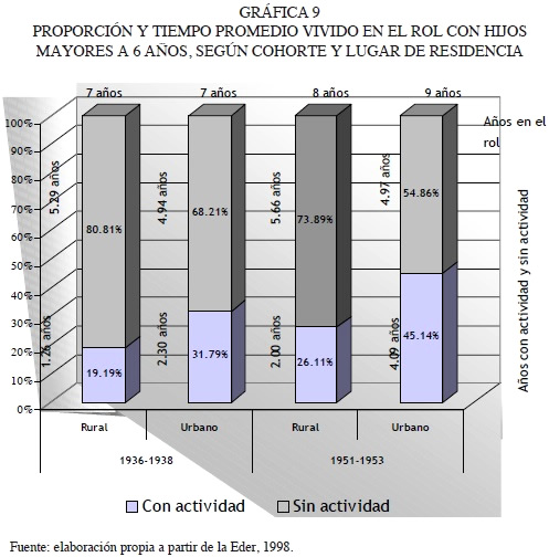 La cohorte 1936-1938 pasó siete años con hijos grandes, tiempo del cual una quinta parte son años con actividad; las sobrevivientes de la cohorte1951-1953 pasaron nueve años en promedio como madres de hijos grandes, de los cuales un poco más de la tercera parte son años con actividad.