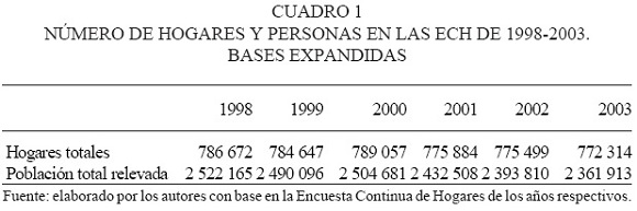 Al aplicarse a los microdatos los correspondientes factores de expansión provistos por el propio INE, se obtuvo en el cuadro 1 la población total estimada en las viviendas incluidas en el marco muestral para cada uno de los años de la serie 1998-2003, donde el número de hogares varía entre 775 000 y 772 000; en tanto que se observa una variación de número de personas de entre 255 000 y 236 000.