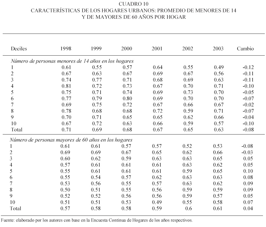 El cuadro 9 muestra estos resultados. A través de los deciles se observan algunos elementos constantes sobre los cuales es posible proponer hipótesis acerca de cuál fue la estrategia general de los hogares frente a la crisis. En promedio y durante los seis años analizados, se constata una disminución del tamaño de los hogares de 3.21 a 3.06 miembros; una caída de la cantidad de perceptores de ingreso de 1.92 a 1.83; en tanto que la tasa de dependencia se mantiene constante en aproximadamente 1.81 miembros por perceptor. Estas tres tendencias se mantienen con leves variaciones en todos los deciles de ingreso, cabe preguntarse entonces si estos cambios se corresponden con la dinámica natural de la segunda transición demográfica en el país, o si por el contrario, integran efectos de la crisis. Si bien, la serie con muestras transversales de hogares no permite responder adecuadamente a esta pregunta, nosotros nos inclinamos por la segunda interpretación.