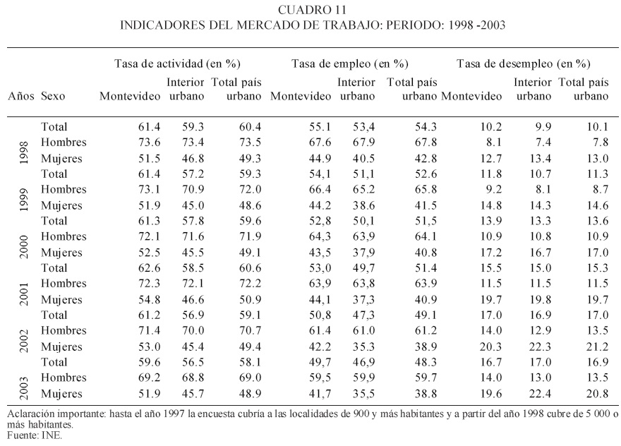 Si se toma como válida la anterior premisa, los efectos de la crisis sobre la distribución del ingreso, y en particular sobre la desigualdad, deberían observarse en el corto plazo. En términos generales, se ha mostrado para otros países que las crisis llevan a una disminución en la desigualdad debido a la pérdida de participación observada en el noveno y el décimo deciles, principalmente compuestos por cuadros gerenciales altos (públicos y privados) y por profesionales universitarios (Cortés y Rubalcava, 1991). Sin embargo, se puede postular que en el caso del Uruguay, las características jurídicas que revisten el empleo público (sindicalización, inamovilidad y convenios) impiden que tal contracción sea significativa. Por el contrario, es razonable pensar que las nuevas condiciones de la pugna distributiva determinadas por la crisis golpeen principalmente a los sectores menos protegidos del mercado de trabajo: empleados no calificados o semicalificados del sector privado formal y principalmente en el sector informal urbano. En consecuencia, será relevante analizar qué parte de los cambios en la desigualdad es explicable por las variaciones endógenas de las categorías ocupacionales.