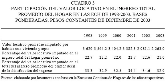 En tercer lugar, resulta evidente el interés en examinar con detalle las implicancias empíricas y teóricas de la decisión oficial de sumar el valor locativo imputado al ingreso corriente monetario total del hogar. El cuadro 3 muestra para la serie aquí analizada cuál es la proporción que representa la imputación de ingresos en el ingreso total del hogar informado por el INE. Tal como se puede apreciar, el INE añade al registro del ingreso de los hogares que poseen en propiedad la vivienda que ocupan, un monto equivalente a entre dos y tres veces el salario mínimo nacional en promedio, que es meramente virtual. En el total de ingresos reportado oficialmente, esta adición representa 22 por ciento del ingreso, guarismo que trepa a 33 por ciento para el caso de los hogares ubicados en el primer decil del ingreso. Una proporción que se ha mantenido relativamente estable a pesar de las oscilaciones ocurridas en los últimos seis años.