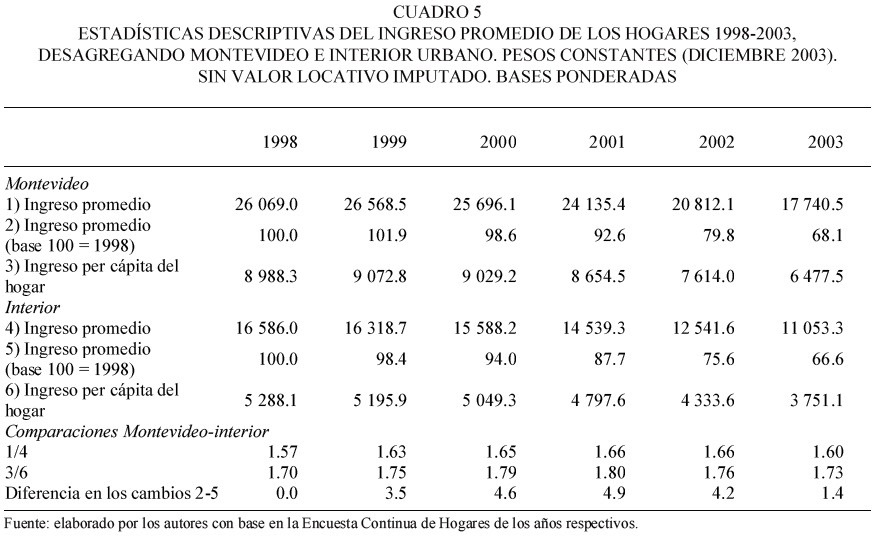 Antes de dar otro paso en el análisis, conviene desagregar las tendencias observadas en el empobrecimiento de los hogares según el lugar de residencia, sea Montevideo o el interior urbano del país. El cuadro 5 muestra que el ingreso medio de los hogares de Montevideo es sensiblemente superior al percibido por un hogar del interior, tal como era esperable en función de todos los antecedentes disponibles (Boado, 2003). La razón oscila entre 1.57 y 1.66 en el periodo para el ingreso medio y entre 1.70 y 1.80 para el ingreso per cápita. Con ello a la esperable diferencia 'regional' se agrega un comportamiento diferenciado de la variable ingreso según área geográfica. Si bien disminuyó el promedio en ambas regiones, fue más pronunciado el descenso en el interior urbano que en Montevideo. Mientras que al final de la serie un hogar montevideano percibía 68.1 por ciento del nivel inicial, un hogar del interior urbano percibía 66.6 por ciento. La caída en el ingreso del interior urbano comienza ya en el año 1999 y los niveles se anticipan un año a Montevideo; también la magnitud de la disminución es sistemáticamente mayor que lo verificado con Montevideo.