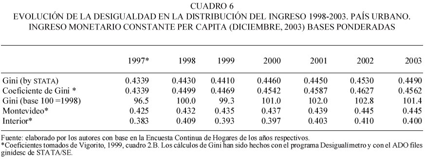 This article checks the change happened in the social distribution of income before and after the long and deep economic crisis initiated in 2000 and that was culminating two years later with the triad of dispossession, devaluation and freezing of the bank deposits in five of the more important national institutions. The information comes from the micro data generated by the Anual Survey of Households for the period 1998- 2003. The principal variable in the analysis is the current income perceived by the members of the household for any concept the month previous to the accomplishment of the survey, expressed in constant income of December, 2003. By means of the use of descriptive statisticians for the period 1998-2003, is observed how it has changed the monetary average revenue of the households in constant weight, and its dispersion, distinguishing between Montevideo and urban localities of the rest of the country. Next we present Gini's coefficients that show an steady increase of the inequality for the six considered years.