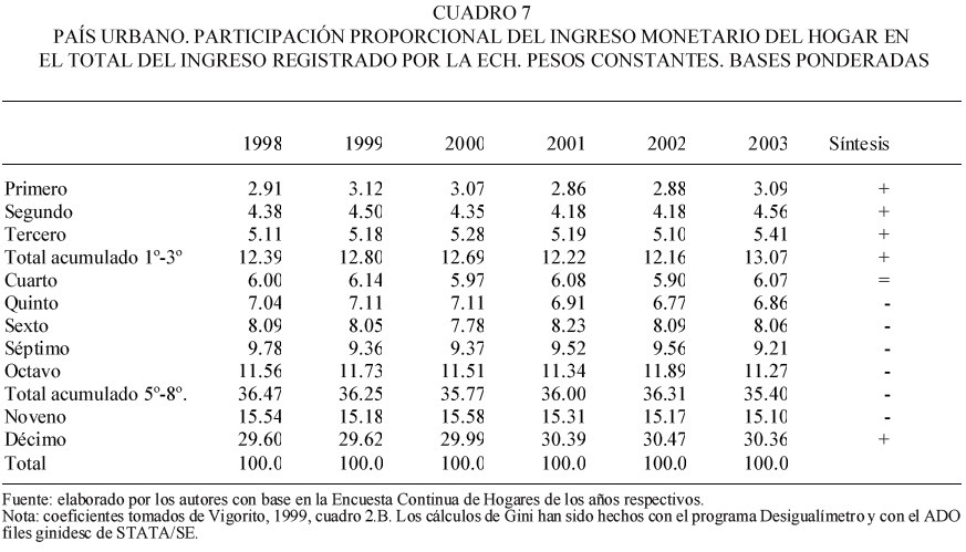 Esta última idea se confirma cuando se considera la tendencia, pero ¿qué ocurre si se observan las participaciones proporcionales de los hogares agrupados por deciles en el total del ingreso registrado para cada año? El cuadro 7 muestra estos datos para cada uno de los años considerados y añade una columna en la que con un signo de más o de menos, según la comparación entre 1998 y 2003, se nos informa que la participación del decil se incrementó o disminuyó en términos absolutos.