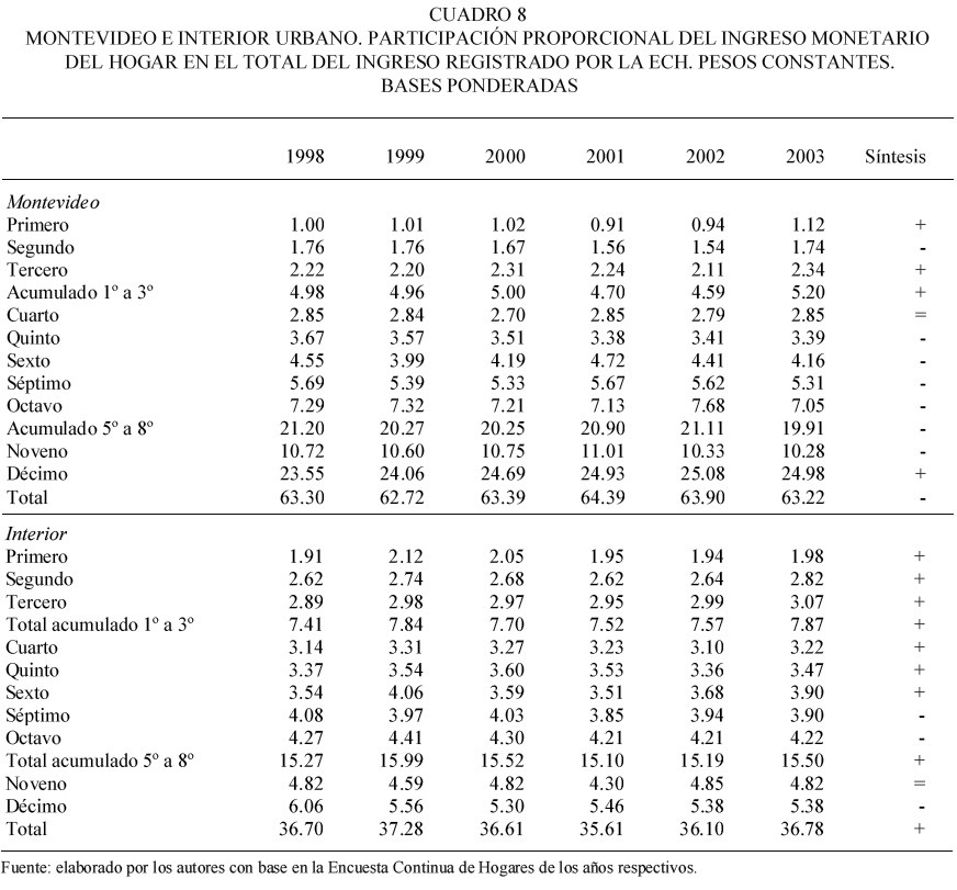 Una segunda observación de rigor en el cuadro 8 conviene hacerla desde la última columna que ensaya una síntesis de los movimientos observados. En Montevideo se replica prácticamente lo ya observado en el total nacional, con dos excepciones: el segundo y cuarto deciles. En el interior, en cambio, todos los deciles entre el primero y el sexto "ganaron" en términos relativos, a pesar del empobrecimiento que se verificó en términos absolutos. Es decir, perdieron menos.