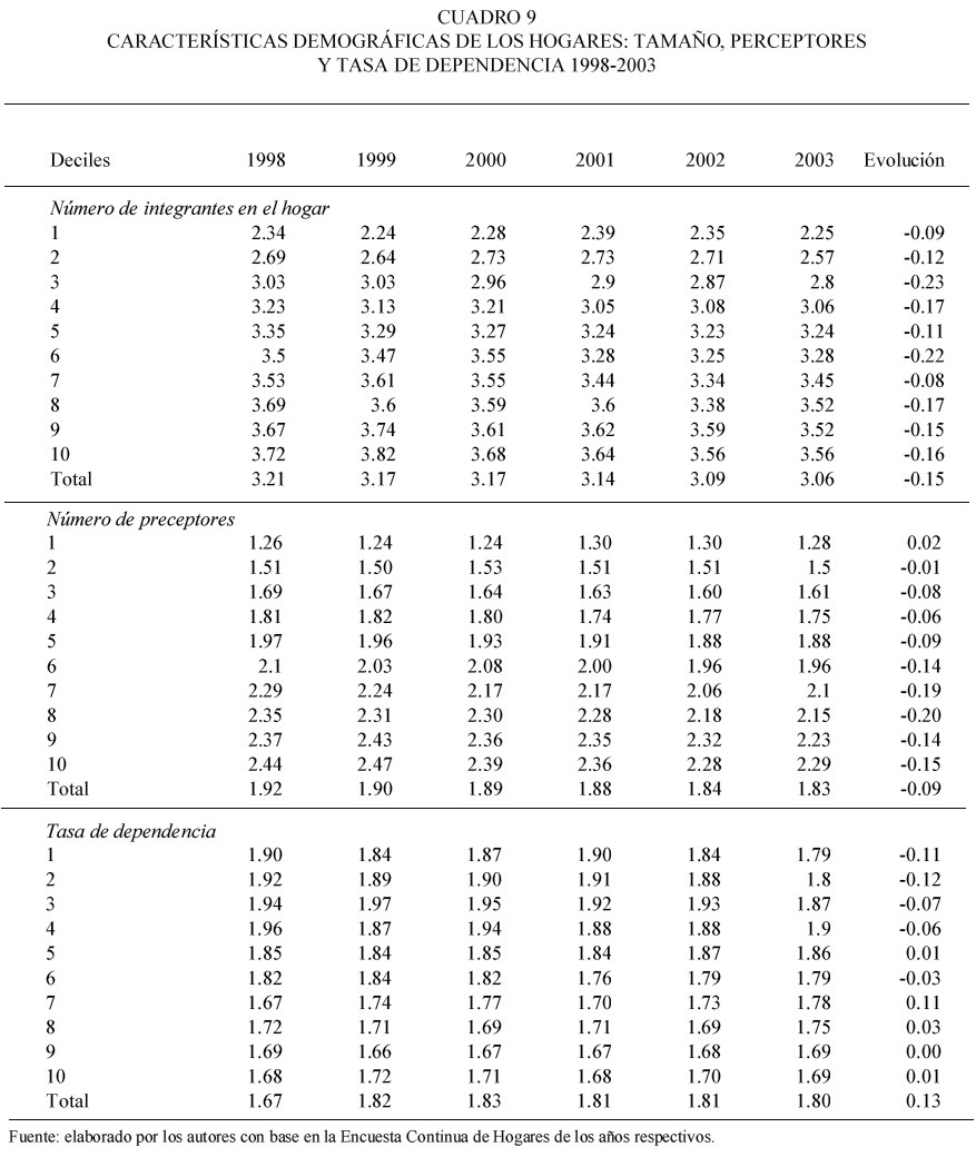 En los deciles primero y segundo, al menos durante dos años, la ECH registra un incremento en el número promedio de integrantes del hogar, cambios que ocurren desfasados según el decil: en el bienio 2001 y 2002 para el primero, y el bienio 2000 y 2001 para el segundo decil. Las caídas más "marcadas" en el tamaño del hogar se verificaron en los deciles tercero, cuarto, octavo, noveno y décimo. En el primer decil se constata además un incremento muy leve en el número de perceptores de ingreso entre los años 2001 y 2003. En los deciles sexto al noveno la caída en el número de perceptores de ingreso es más acentuada. Como resultado de los dos subprocesos anteriores, en los primeros cuatro deciles se produjo una caída en la tasa de dependencia, aunque fue más pronunciada en los dos primeros. En los restantes deciles, la pérdida de miembros siguió un movimiento paralelo a la pérdida de perceptores. En el séptimo decil, al contrario, creció la tasa de dependencia. En todas las series, el año 2003 muestra un retroceso frente al 2002.