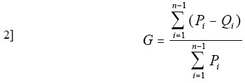 De la ecuación uno se deduce que si no existiera discrepancia entre la distribución observada y la distribución equidemocrática, entonces el grado de concentración medido por el coeficiente de Gini equivaldría a cero; si la discrepancia es máxima como en el caso de que una sola unidad concentre todo el ingreso, el Gini tomará valor uno. Formalmente, este coeficiente se define: