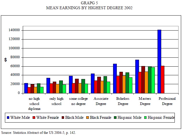 Unfortunately, women at all levels of educational attainment have lower average earnings than their male counterparts. The differences are greatest for white women with respect to white men and tend to rise as educational attainment increases (graph 5).