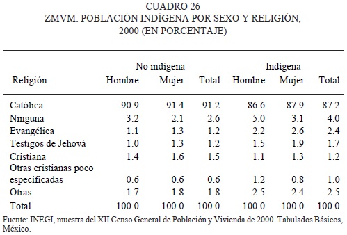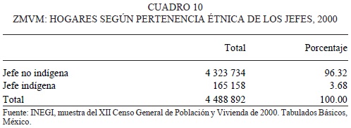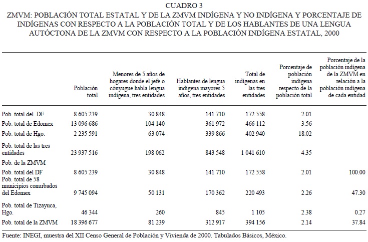Respecto del total de la población de cada entidad y de la ZMVM en su conjunto, los indígenas son relativamente pocos, ya que representan apenas 2.14 por ciento de la población metropolitana, 2.01 por ciento de la población del Distrito Federal, 2.26 por ciento de la de los municipios conurbados mexiquenses y 2.38 por ciento de la población de Tizayuca, Hidalgo.3