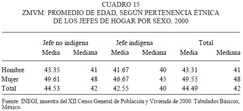 La edad mediana de los jefes de hogar indígenas es de 40 años, dos años menor que las de los no indígenas. Sin embargo, la mayor diferencia se da en las jefas de hogar. Las no indígenas tienen una edad mediana de 48 años, mientras que en las indígenas es de 45 años, una diferencia de tres años. Ello nos indicaría que estas mujeres, las indígenas, se están quedando solas (por divorcio, viudez o abandono) a una menor edad que las no indígenas y que se tienen que hacer cargo de sus hogares cuando probablemente sus hijos son más pequeños que los de sus contrapartes no indígenas. No obstante, hay que recordar que aparentemente hay menos disoluciones de uniones entre los indígenas que entre los no indígenas y que las mujeres indígenas se unen a una menor edad que las no indígenas. En cualquier caso, para toda la población lo que se puede observar es que los jefes de hogar, en general, son personas adultas, ya maduras.