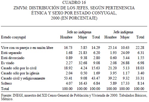 En el caso de los jefes hombres de ambos grupos, solamente alrededor de cinco por ciento entran en esa situación por esos factores. Asimismo, sin olvidar que estamos hablando de jefes de hogar, es llamativo que un mayor número de jefas mujeres (indígenas y no indígenas) son jefas de hogar cuando están solteras y muy pocas cuando están unidas. Los hombres jefes de hogar solteros, en cambio, presentan cifras bastante menores y tal pareciera que, para llegar a ser jefe, en la mayoría de los casos un varón debe primero estar o haber estado unido en matrimonio. En otro aspecto, aunque la religiosidad de los indígenas se da por un hecho, el número de jefes indígenas casados ya sea solamente por la iglesia o civil y religiosamente es casi nueve por ciento menor que el de los jefes no indígenas, y aumenta bastante el de los que solamente están unidos consensualmente con su pareja: ocho por ciento más para los indígenas (a este respecto, ver apartado sobre religión) cuando cabría haber esperado que las cifras de los indígenas fueran mayores en ese aspecto. Por supuesto, los costos y compromisos asociados con una boda por lo religioso pueden hacer que muchas parejas opten por no realizarla o, quizás, llevarla a cabo más adelante en el transcurso de su vida en común.